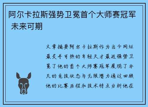 文章摘要:阿尔卡拉斯,作为当今网坛最炙手可热的年轻天才,最近强势卫冕了他的首个大师赛冠军,展现了非凡的竞技状态与无限潜力。通过回顾他的比赛历程和技术特点,分析他在网球界的崛起与未来可期的前景,可以说阿尔卡拉斯不仅仅是当今的明星选手,更是未来网球赛场的领军人物。本文将从四个方面深入探讨阿尔卡拉斯的卫冕之路以及他的未来前景:首先,我们会从他的比赛技术分析入手,探索他的独特打法;接着,从心理素质和比赛经验角度分析他的成熟与稳定;然后,分析他与顶级球员之间的竞争关系,最后,探讨他未来可能的发展轨迹及对网球世界的影响。
