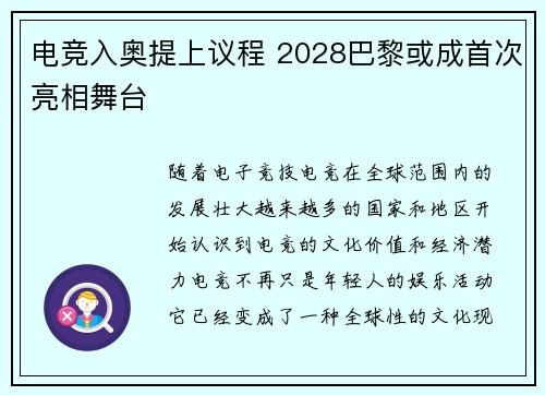 随着电子竞技(电竞)在全球范围内的发展壮大,越来越多的国家和地区开始认识到电竞的文化价值和经济潜力。电竞不再只是年轻人的娱乐活动,它已经变成了一种全球性的文化现象,拥有了庞大的观众群体和巨大的产业链。这一现象也引起了国际奥委会(IOC)的关注,关于“电竞是否能成为奥运会项目”的讨论逐渐升温。在这个背景下,2028年巴黎奥运会或将成为电竞首次亮相奥运舞台的关键时刻,电竞入奥的提案也正在逐步进入议程。本文将从四个方面详细探讨电竞入奥提上议程及2028年巴黎奥运会可能迎来电竞首次亮相的情景,分别为:电竞的全球化发展与奥运的契合、电竞的技术创新与体育精神的融合、电竞产业的经济效应与奥运会的影响、电竞入奥的挑战与前景展望。